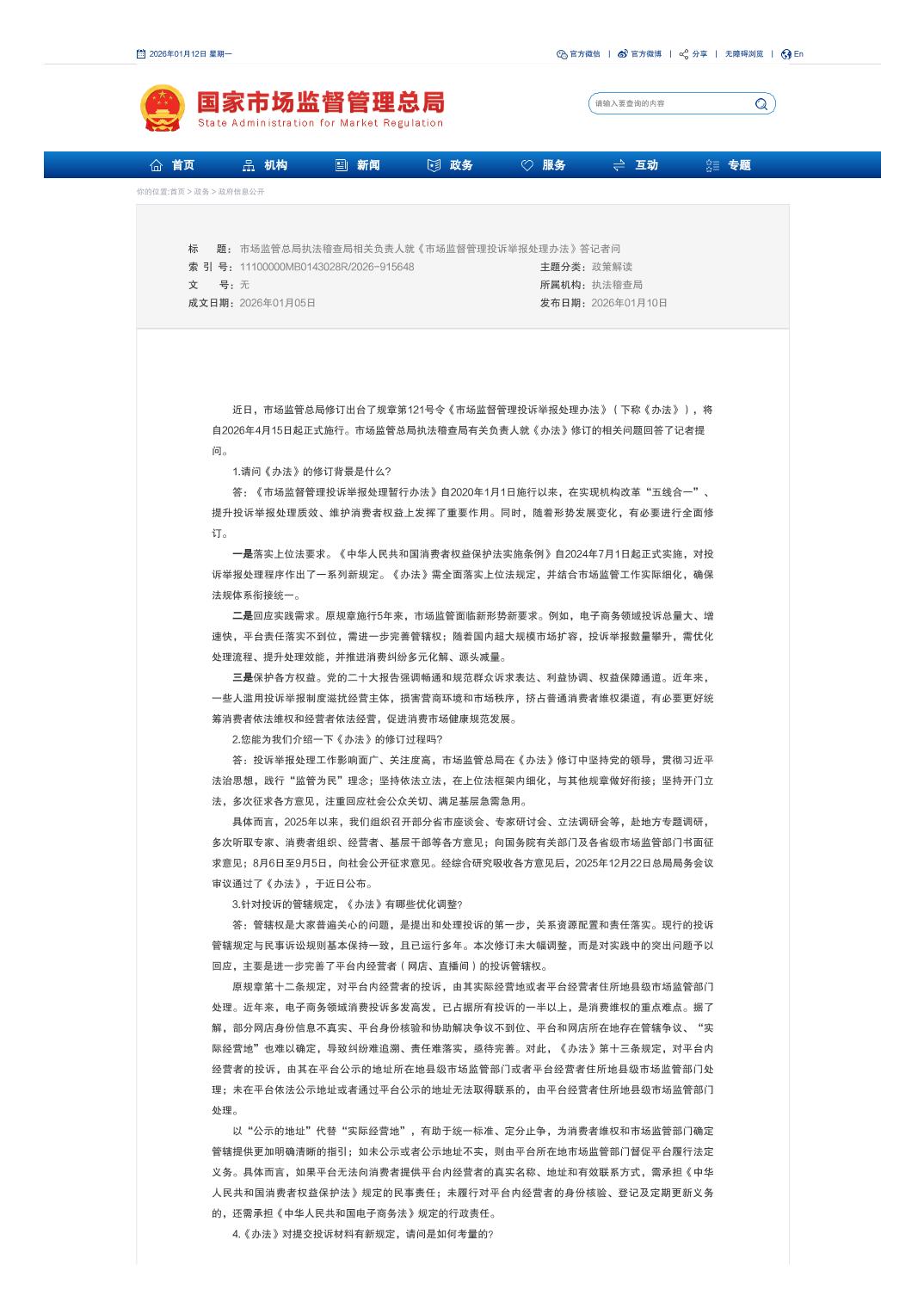 【政策解读】市场监管总局执法稽查局相关负责人就《市场监督管理投诉举报处理办法》答记者问