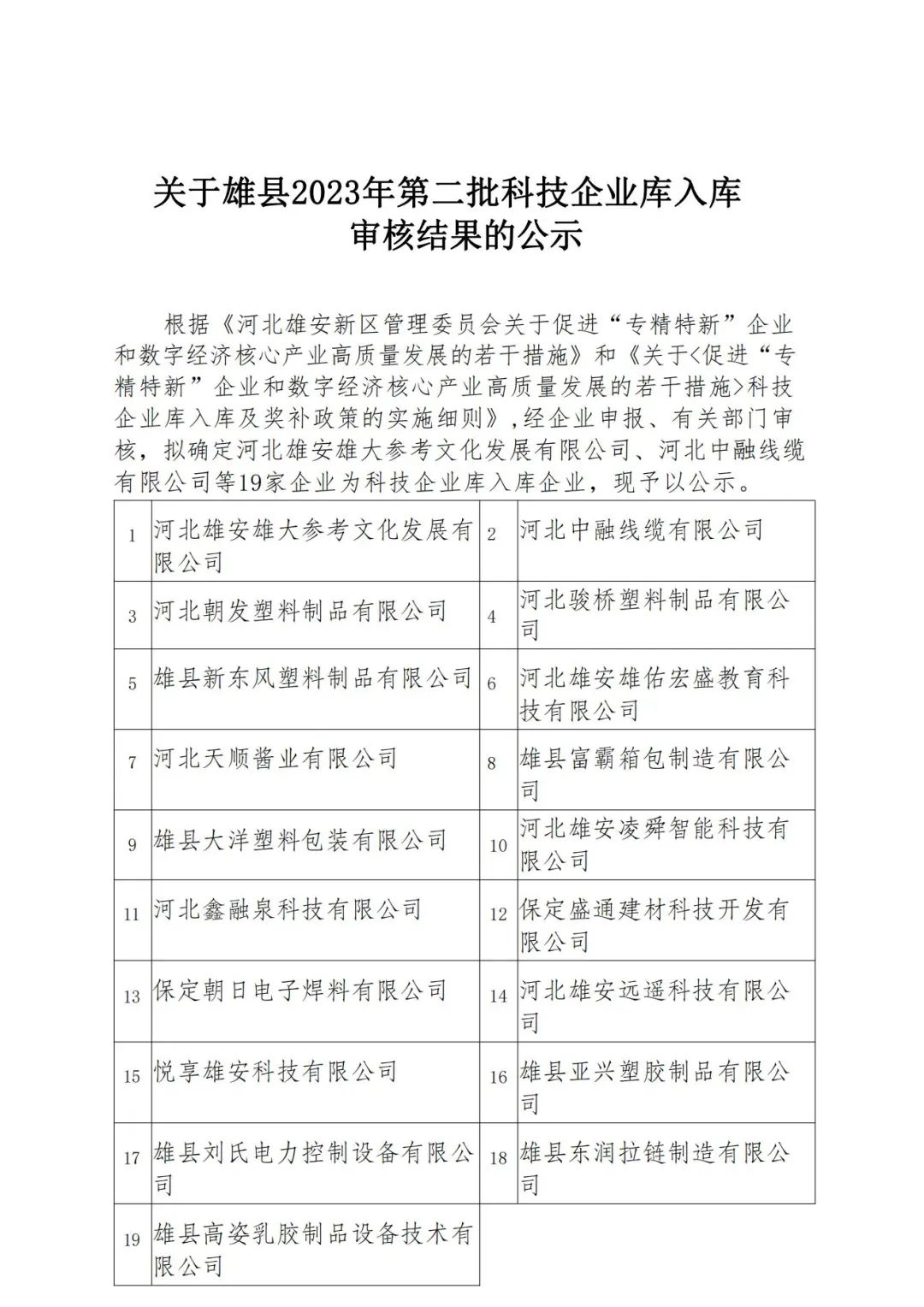 关于雄县2023年第二批科技企业库入库审核结果的公示